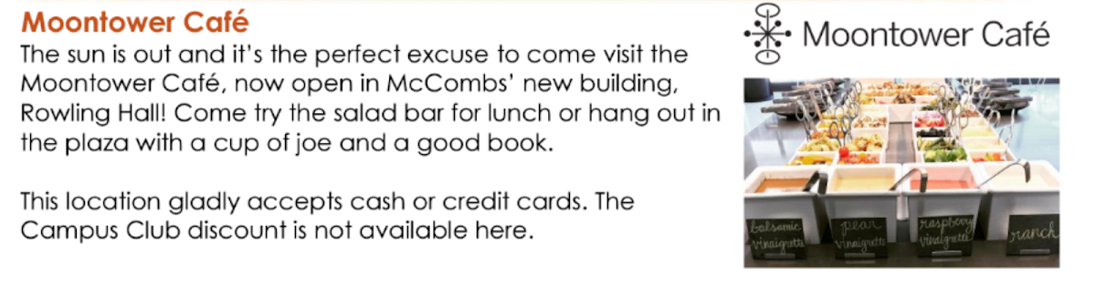 Another thing that sets Moontower Cafe In Rowling Hall apart from other spots in the area is its location. Situated in Austin’s bustling neighborhood near the University of Texas, it’s easily accessible for both locals and visitors. Whether you’re a student looking for a study break or a local resident craving a delicious meal, the cafe is conveniently located to suit a wide range of needs. It's also just a short walk from the university, making it a popular stop for students after a long day of classes or study sessions.